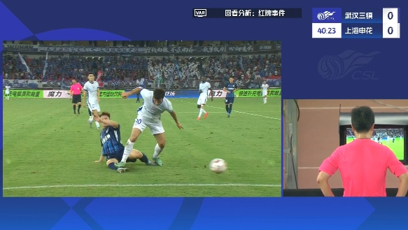 判例二:中超联赛第23轮,武汉三镇VS上海申花。比赛第40分钟,上海申花10号队员右脚踩到武汉队倒地队员腿部,裁判员未判罚犯规。VAR介入。裁判员经在场回看后,判上海申花10号犯规,并出示黄牌警告。
